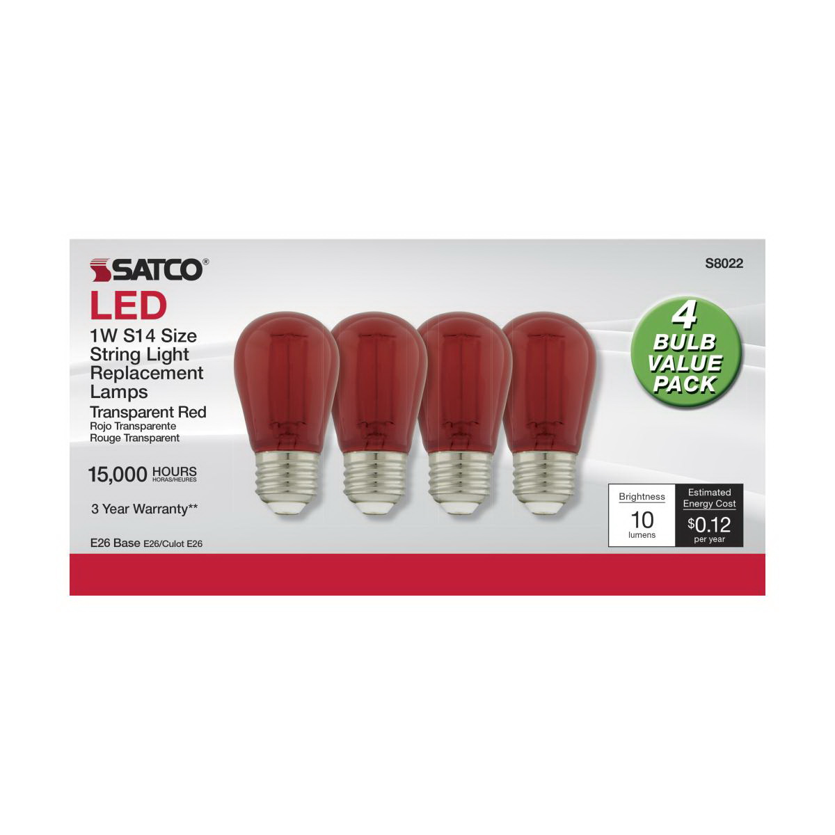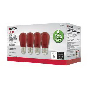 Nuvo Lighting LED Bulb, Flood/Spotlight, Wattage Rating: 1 W, 120 V, Lamp Base: E26, Lamp Shape: S14, Lamp Finish: Transparent Red, Lumens: 40 Lumens, Average Life: 15,000 hr, Beam Angle: 360 deg, Dimensions: 1.81 in Dia x 3.43 in L, Operating Temperature: -4 to 104 deg F, Incandescent Equivalent: 11 W