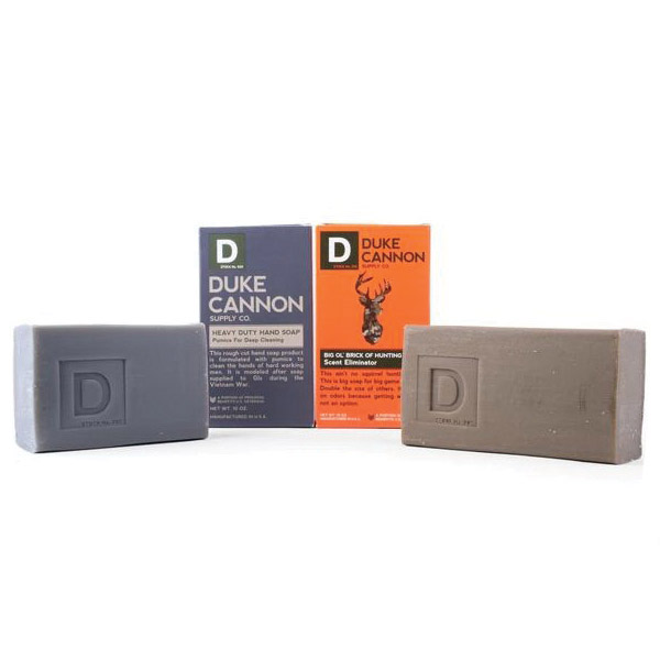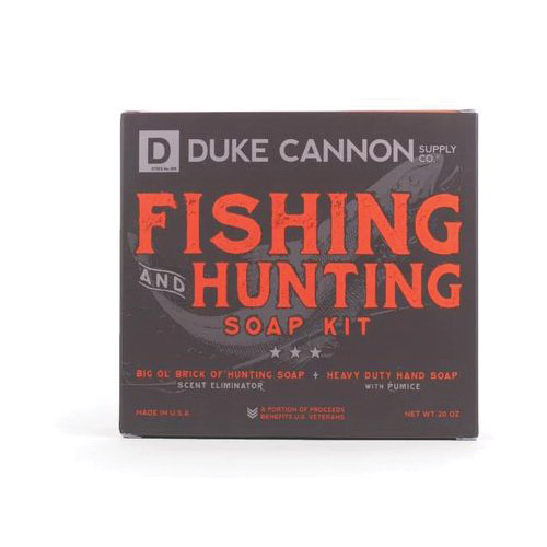Here we have for sale the hunting and fishing soap kit. Or perhaps it's the fishing and hunting soap kit. Truth be told, it's both. Either way, this soap kit is not for the man who hunts squirrels or fishes for sunnies. This sturdy box contains two different 10 oz bricks of soap for the outdoorsman who takes his leisure seriously. The Big Ol brick of hunting soap has a unique scent-eliminating formula that captures odors and prevents their release so you don't get winded. Won't dry you out either. The heavy-duty hand soap is made with better-grade pumice and works hard to remove dirt, grease, guts and fish odor from a man's hands. Has a subtle citrus scent.