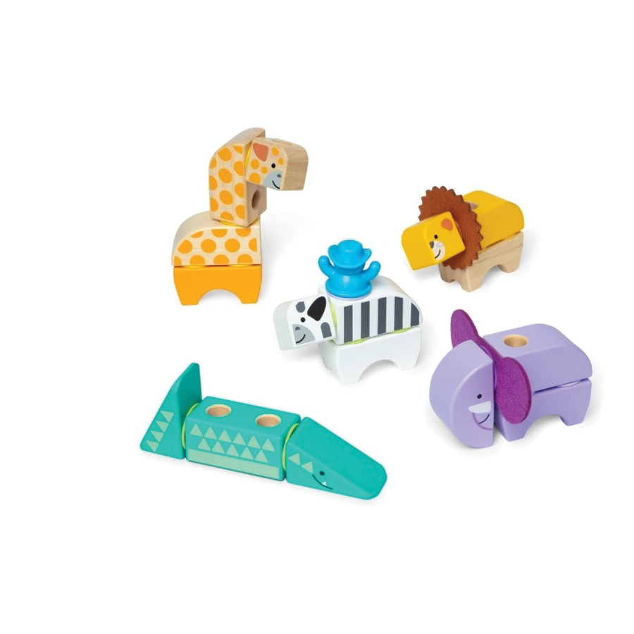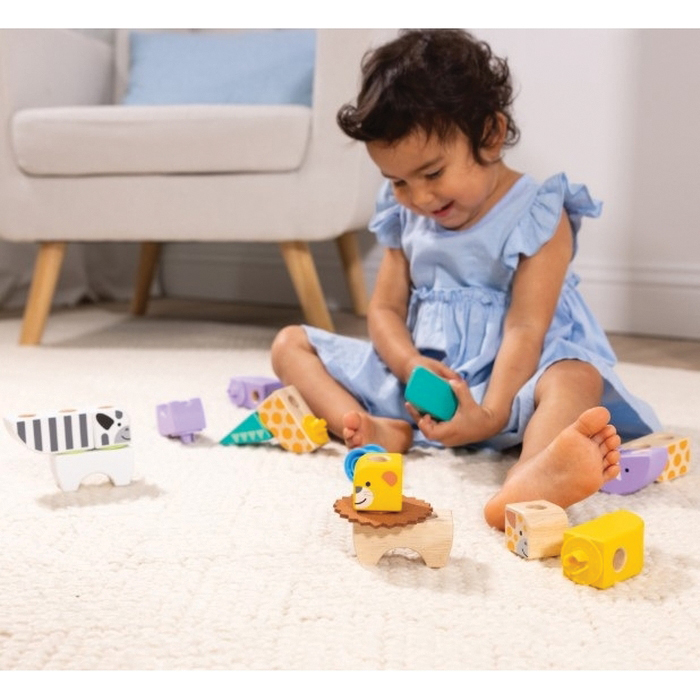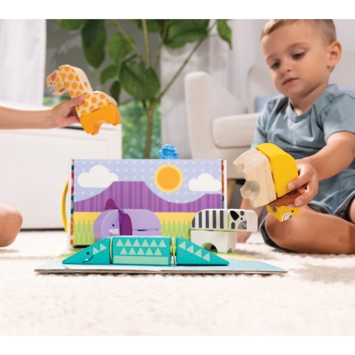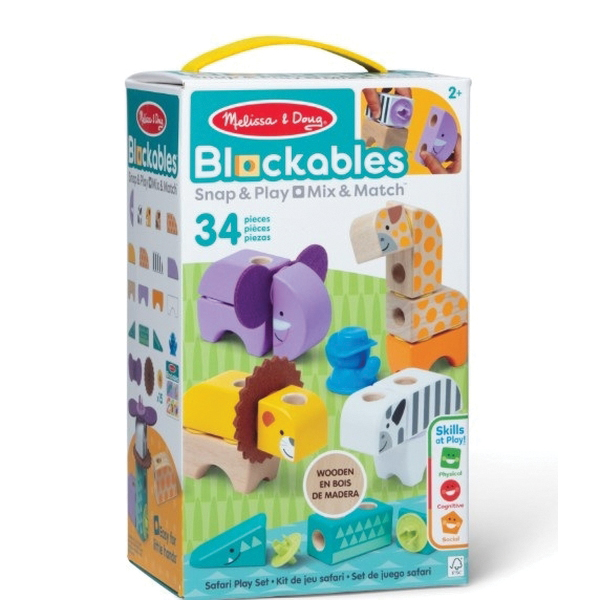 Melissa & Doug Blockables™ are linkable, stackable and playable. The solid wood connect-and-play building blocks are ideal manipulatives to help preschoolers two and older boost developmental skills (fine motor, problem-solving, matching, storytelling and self-esteem), while using their imaginations and having fun. Easy-to-grasp smooth, colorful wooden blocks fit together in a snap with large connectors that even little hands can push in and pull out. An illustrated guide shows how to arrange and link the Blockables™ to create multi-textured safari animals (zebra, alligator, lion with felt mane, elephant with felt ears and giraffe) or kids can use their imaginations to mix, match and combine pieces to make unique figures and play their own way. Kids can easily expand their collection the 34-piece safari play set is compatible with all other Blockables™ play sets. The packaging folds out to convert into a fun play space and pieces store in the sturdy corrugated box with a soft handle for easy cleanup and portability. Patent pending.