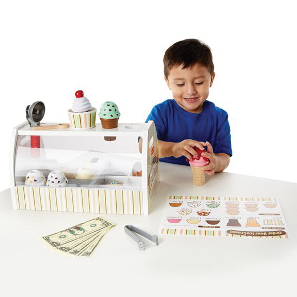 Includes | : | Wooden Ice Cream Counter, (8) Ice Cream Scoops, (6) Toppings, (2) Cones, Cup, Scooper, Tongs and Wooden Spoon |