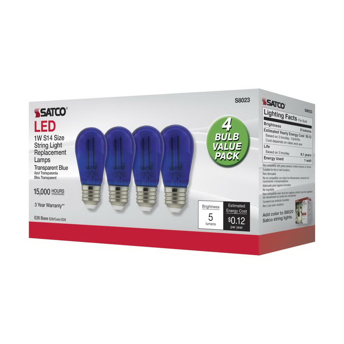 Nuvo Lighting LED Bulb, Flood/Spotlight, Wattage Rating: 1 W, 120 V, Lamp Base: E26, Lamp Shape: S14, Lamp Finish: Transparent Blue, Lumens: 15 Lumens, Average Life: 15,000 hr, Beam Angle: 360 deg, Dimensions: 1.81 in Dia x 3.43 in L, Operating Temperature: -4 to 104 deg F, Incandescent Equivalent: 11 W