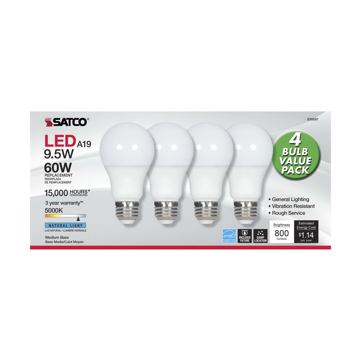 Nuvo Lighting LED Bulb, General Purpose, Wattage Rating: 9.5 W, 120 V, Lamp Base: E26, Lamp Shape: A19, Lamp Finish: Frosted, Lumens: 800 Lumens, Light Color: Natural Light, Color Temperature: 5000 K, Color Rendering Index (CRI): 80, Average Life: 15,000 hr, Beam Angle: 220 deg, Dimensions: 2.36 in Dia x 4.33 in L, Operating Temperature: -4 to 113 deg F, Incandescent Equivalent: 60 W