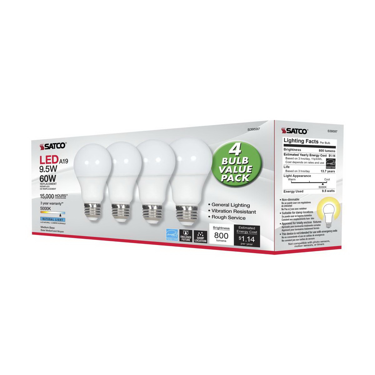 • Nuvo Lighting S39597 LED Bulb, 120 V, 800 Lumens, 9.5 W, A19 Lamp, 60 W Equivalent, E26 Lamp Base, Frosted, 4 BX
