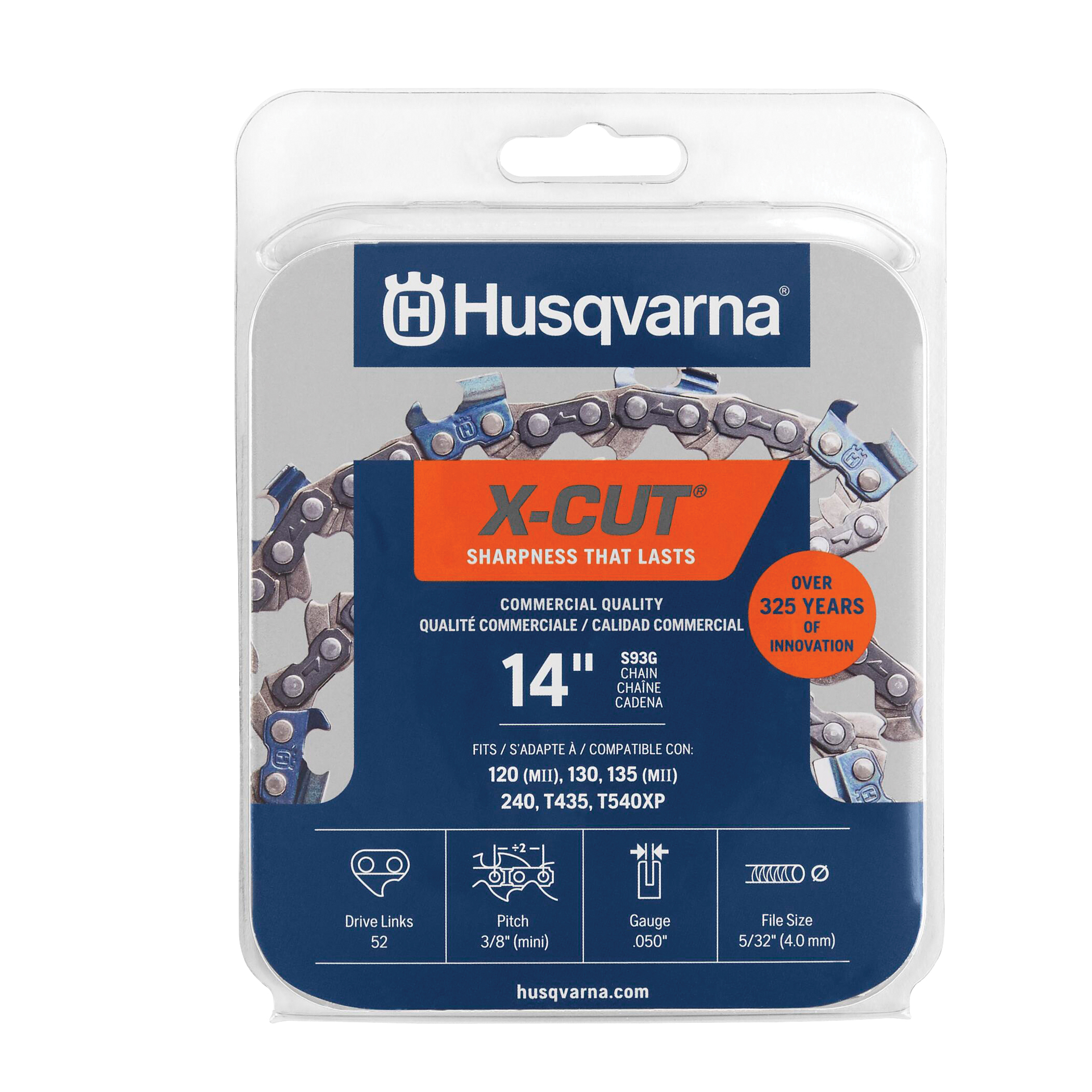 Give your chainsaw excellent precision and performance in narrow spaces with the Husqvarna X-Cut 14 in chainsaw chain. This chainsaw chain is compatible with the Husqvarna 120 (MII), 130, 135 (MII), 240, T435 and T540XP models. Due to its smooth operation, lasting sharpness and low kickback, these Husqvarna chainsaw chains generate high cutting efficiency while improving maneuverability and reducing body strain. These reliable chainsaw accessories are designed with a balanced combination of materials and manufacturing processes to generate high durability. In addition, the replacement chainsaw chain is pre-stretched to work longer without needing to be adjusted. Oil-shaped channels in the links transport oil to the X-Cut for superior lubrication and less wear and tear on your Husqvarna chainsaw chain. With excellent precision and performance in narrow spaces, these chainsaw blades are ideal for arborists and suitable for everyday professional use and all standard cutting tasks.