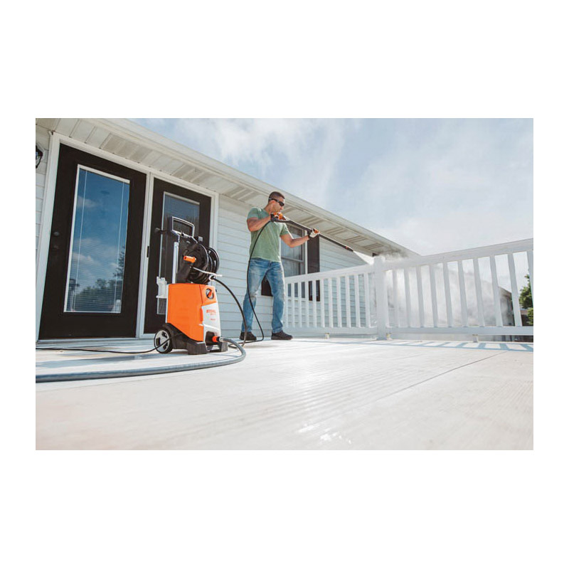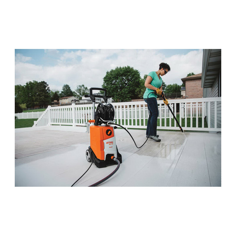 The compact, lightweight Stihl RE 110 electric pressure washer provides an easy-to-use solution to help you with your cleaning to-do list. The RE 110 delivers 2000 psi water pressure to quickly and efficiently clean decks, driveways, side walks and more. With it's integrated pressurized hose reel, users can easily wind and unwind the 23 ft high-quality hose unlike storage reels where the high-pressure hose must be connected and disconnected with each use. It also makes it easy to store when done. Additionally, it comes with an adjustable flat-jet nozzle, rotary nozzle and a detergent sprayer to tackle a variety of jobs around the home and garden. Ideal for cleaning automobiles, boats and more, the RE 110 maximizes energy efficiency by shutting down the motor when the wand is released and reactivating the motor when the trigger is reengaged.