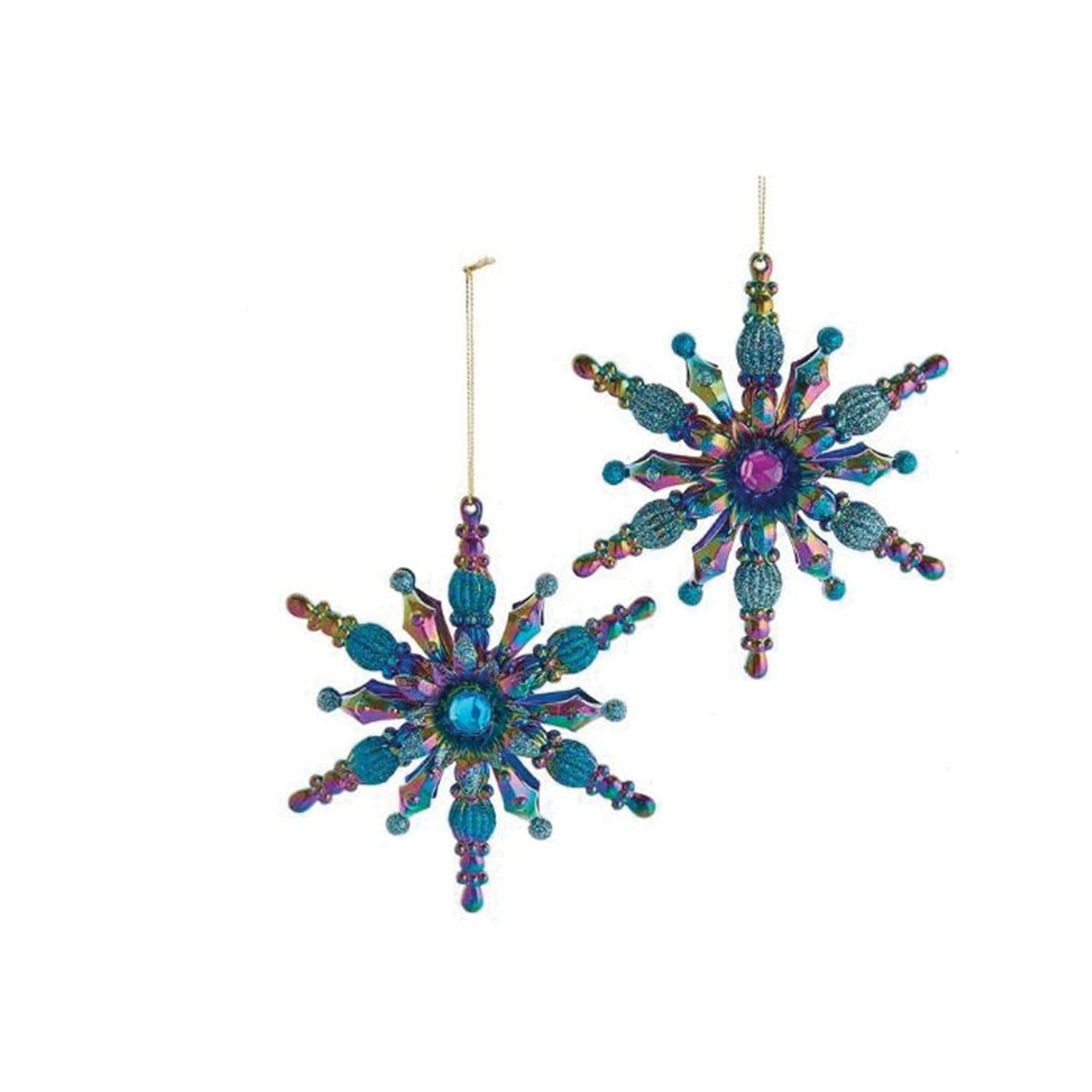 These festive and unique peacock color glittered snowflake ornaments are a ideal addition to any holiday or home decor. This assortment features two blue, purple and green glittered snowflakes with either a blue or purple gemstone center.