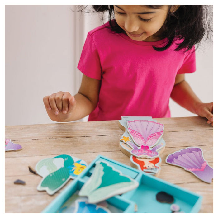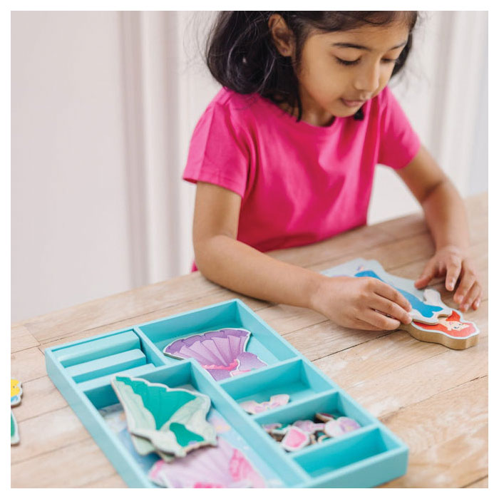 Ariels mix and match fashions are sure to make a splash. Kids can combine the 30+ sturdy wooden magnetic pieces to tell the tale of the little mermaid or create their own fashion story.