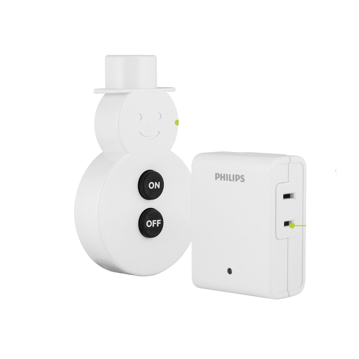 Get into the holiday spirit with the Philips wireless ON/OFF switch with snowman remote. The indoor receiver is ideal for seasonal lighting, decorations, wax-melting air fresheners and other small appliances. It is compatible LED, CFL and incandescent bulbs while offering easy plug-in installation. One side access polarized outlet on the receiver allows placement behind furniture and in other tight spaces. The remote features a festive snowman design, provides ON/OFF operation and includes one CR2032 battery for wireless operation. A 100 ft range supports use in even your largest rooms. By not requiring hubs, Wi-Fi or any additional equipment, the system provides a simple alternative to complex home automation devices. You're in control of the season with the Philips wireless ON/OFF switch with snowman remote.