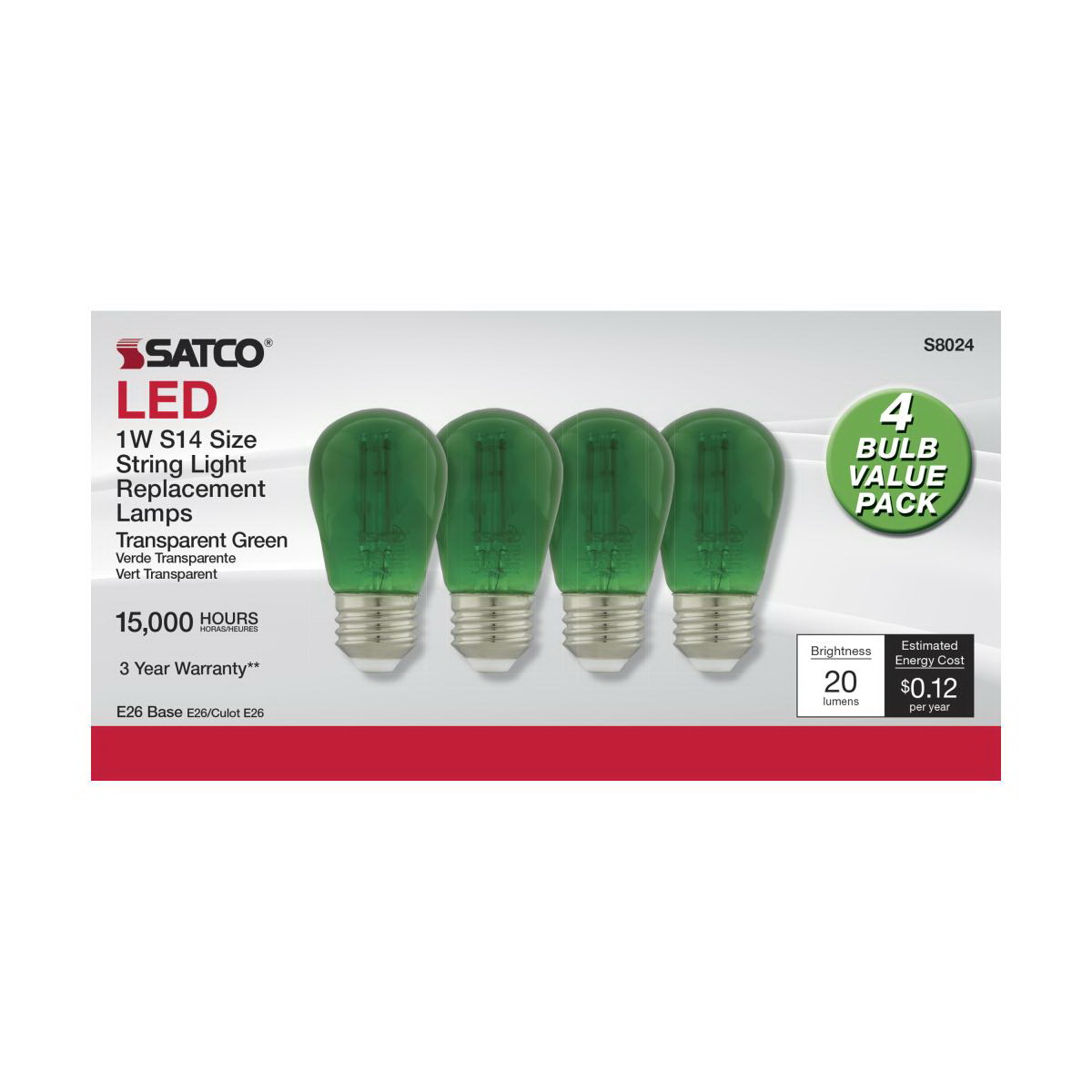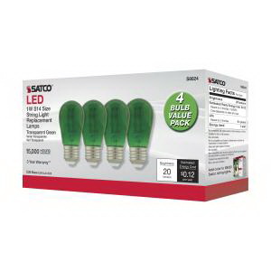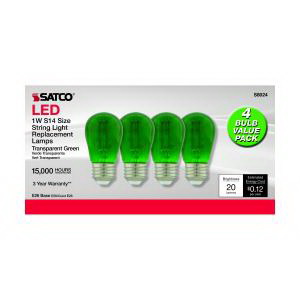 Nuvo Lighting LED Bulb, Flood/Spotlight, Wattage Rating: 1 W, 120 V, Lamp Base: E26, Lamp Shape: S14, Lamp Finish: Transparent Green, Lumens: 30 Lumens, Average Life: 15,000 hr, Beam Angle: 360 deg, Dimensions: 1.81 in Dia x 3.43 in L, Operating Temperature: -4 to 104 deg F, Incandescent Equivalent: 11 W