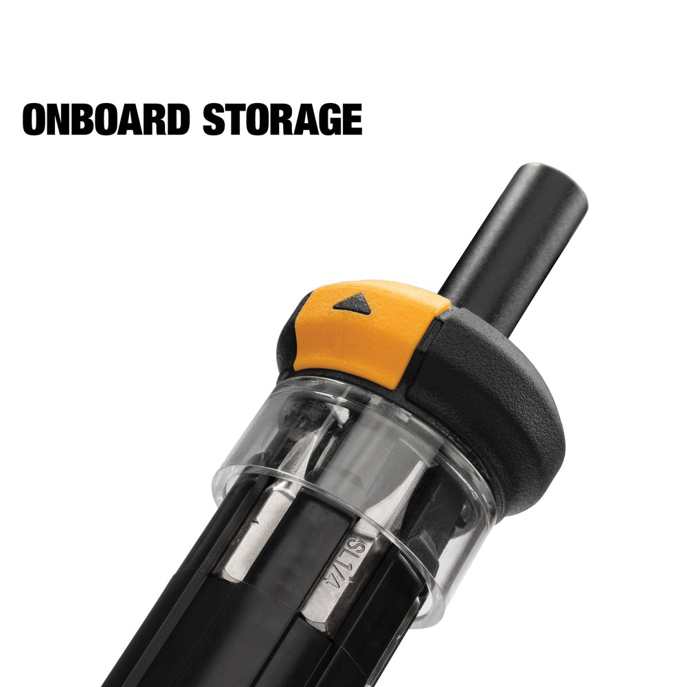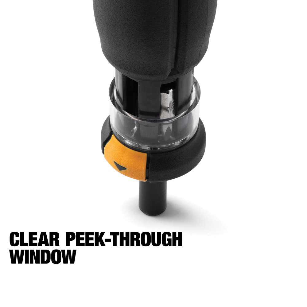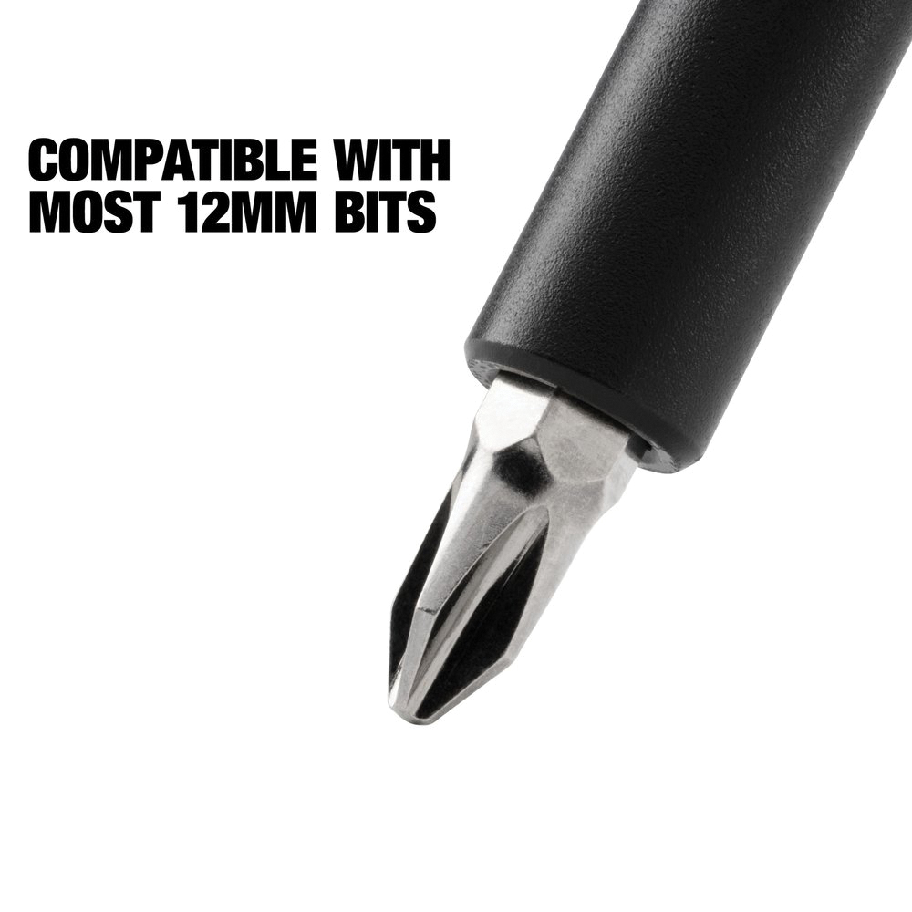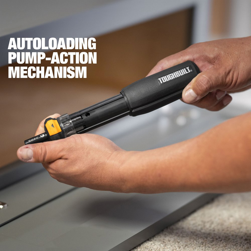 The ToughBuilt® auto loading multi-bit driver is a versatile set with 6 bit tips stored inside of the ergonomic handle. The pump-action reloading mechanism rapidly loads and retracts bits. It's easy to see all the bit tips through the clear window. The tri-panel rubber-over molded grip increases control and comfort in the hand. A black chrome-plated steel barrel resists rust and provides the durability needed by demanding Pros.