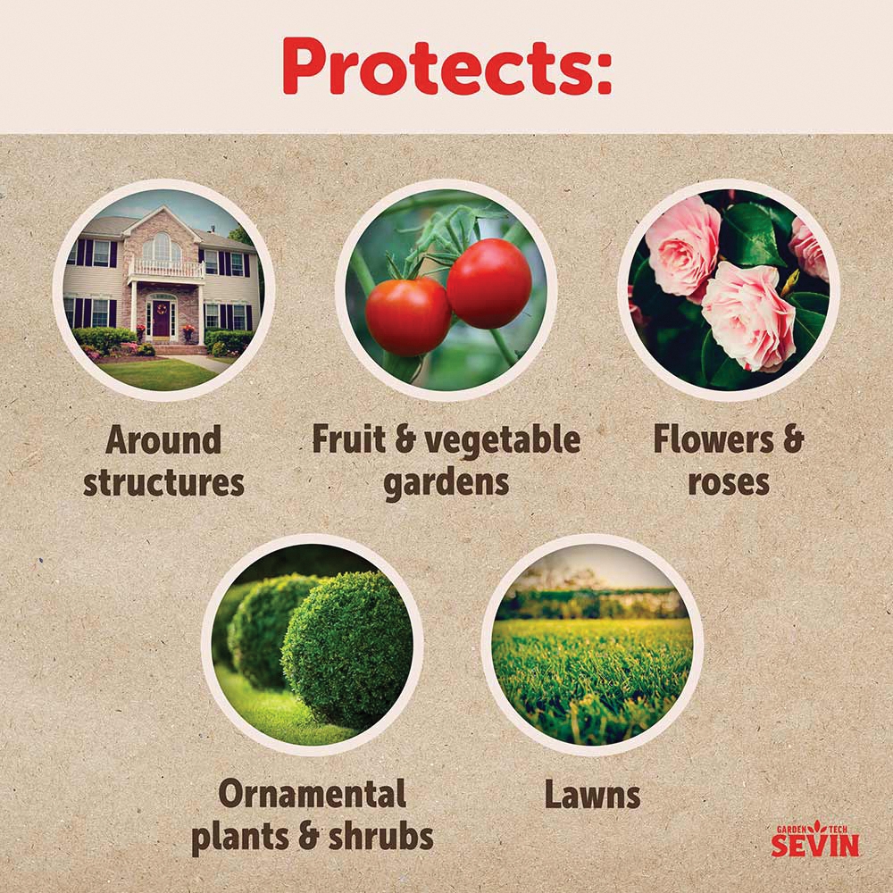 Protect your vegetables and flowers from damaging pests with Seven insect killer ready-to-use2. This formula will not harm your roses, trees, shrubs, flowers or edibles. Simply shake well and spray. For top results, adjust nozzle to narrow fan spray and holding the sprayer about 1 ft from the plant, spray just enough to cover the area that is to be treated. Seven insect killer ready-to-use2 kills more than 700 insect pests on contact - with visible results in minutes. Use this to kill and control unwanted insects in fruit and vegetable gardens, flowers, roses, trees and shrubs. Seven ready-to-use2 is ideal for the protection outdoors around the home from pests like ants, hornworms, stink bugs, Japanese beetles, aphids, Colorado potato beetles, whiteflies, cabbage loopers and many more Do not spray-on open blooms to protect pollinating insects. Once applied to area, wait at least 24 hours before watering. This formula is highly effective and fast-acting - don't forget to check the label to find the specific application rates for the list of pests.