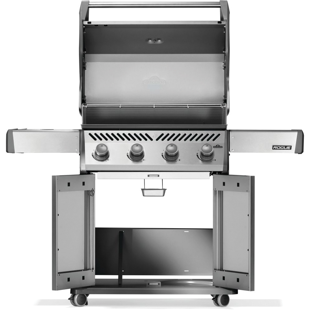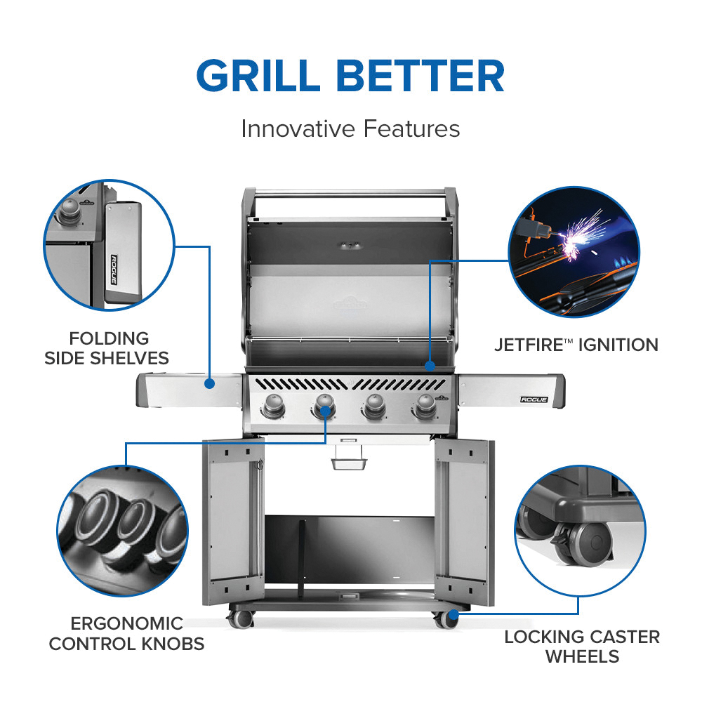 The sleek Napoleon Rogue® 525 propane gas grill in black is a stylish upgrade for your outdoor living space. Achieve the best sear marks with our Wave cast iron grids. Four stainless steel burners ensure precise temperature control, while dual-level sear plates intensify flavors by vaporizing drippings. With 525 sq-in of grilling space, create mouthwatering meals for any occasion. The easy-to-maintain porcelainized lid and powder-coated body seamlessly blend with your outdoor decor. Maneuver with ease using locking casters and save space with folding stainless steel side shelves. Experience unmatched versatility, quality and affordability with this Napoleon Rogue® gas grill.