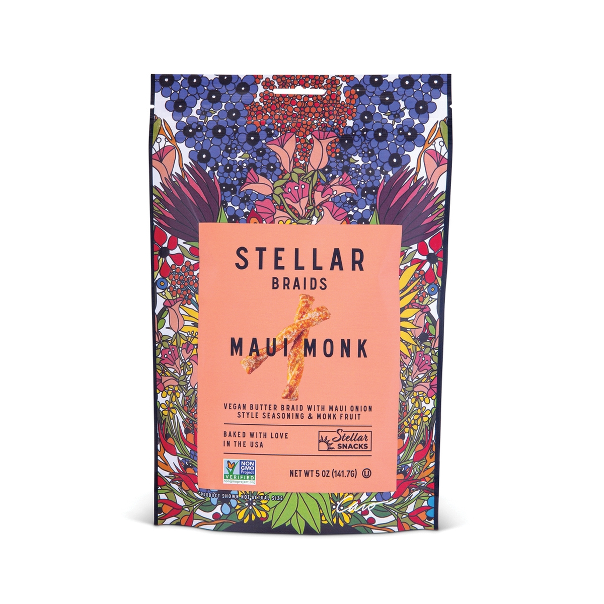 Stellar Snacks Snack, Net Content: 5 oz, Flavor: Maui Monk, Nutritional Information: 120 Calories, 4 g Total Fat, 0 g Saturated fat, 0 g Trans fat, 0 mg Cholesterol, 420 mg Sodium, 18 g Carbohydrate, 1 g Dietary Fiber, 1 g Sugar, 1 g Added Sugar, 3 g Protein, 0 mcg Vitamin D, 0 mg Calcium, 1 mg Iron, 0 mg Potassium, Servings: 5