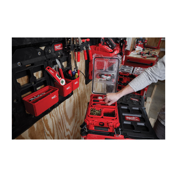Milwaukee PACKOUT™ organizers and compact organizers (48-22-8430 and 48-22-8435) and hung on mounting plates. Constructed with an impact-resistant body, these bins are built to withstand harsh jobsite conditions. Each large bin features a removable interior organization tray to organize jobsite supplies. These large storage bins can be used to organize and store small items like fittings, fasteners, bits and more. Our large bin set includes (2) bins, (2) interior organization trays and (6) removable dividers. Milwaukee PACKOUT™ is the industry's most versatile and durable modular storage system.